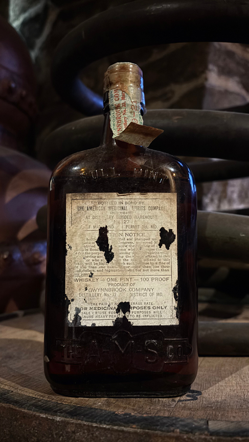 Bottle Information: Made in the spring of 1921, bottled in the fall of 1933. This is the classic square bottle, reimagined by National Distillers, the new face for American Medicinal Spirits Company, at the tail end of prohibition. Notably, this is not distilled by the same Hannis Distilling Company from the previous bottlings but an introduction to another Maryland distillery called Gwynnbrook, RD #33. Given this is a prohibition-produced bottle, the whiskey was moved to and stored at the Baltimore Distilling Co. in concentration warehouse number 27 in Maryland. It was released just before the 21st Constitutional amendment repealed the 18th amendment of prohibition.