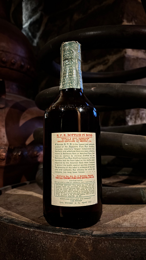 Bottle Information: Bottled in spring 1941, this four year bottled in bond pure rye whiskey was distilled at the Baltimore Pure Rye Distilling Co. (BPR) in Dundalk, Maryland, in 1937. This is an example of a distillery's return to making pre-prohibition rye whiskey after the end of prohibition. This has no physical connection to any of the previous bottlings other than the relative proximity to the Maryland style. Its inclusion is due in part to the reputation for extraordinary quality that whiskey in this era produced. A 1941 ad called BPR rye "the most famous whiskey state's most famous whiskey."